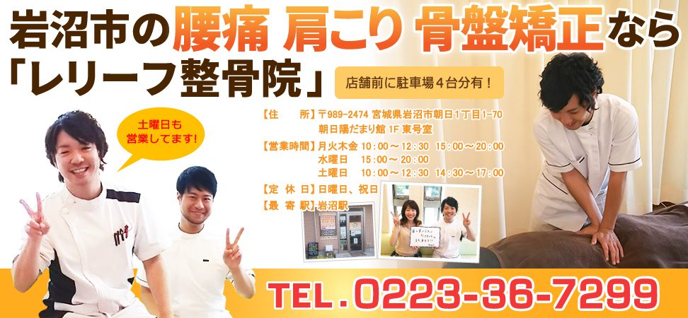 岩沼市のレリーフ整骨院は、腰痛 肩こり 骨盤矯正の整体を得意としています。