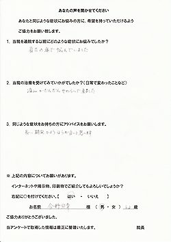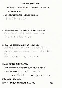 施術は普通の整骨院とは違い、あまり受けたことのない内容でしたが、自分の体のゆがみを認識させてくれたり、日常生活のアドバイスやストレッチ方法などを丁寧に教えてくれました。今ではしびれが気にならずに仕事も生活もできるようになったのが良かった。