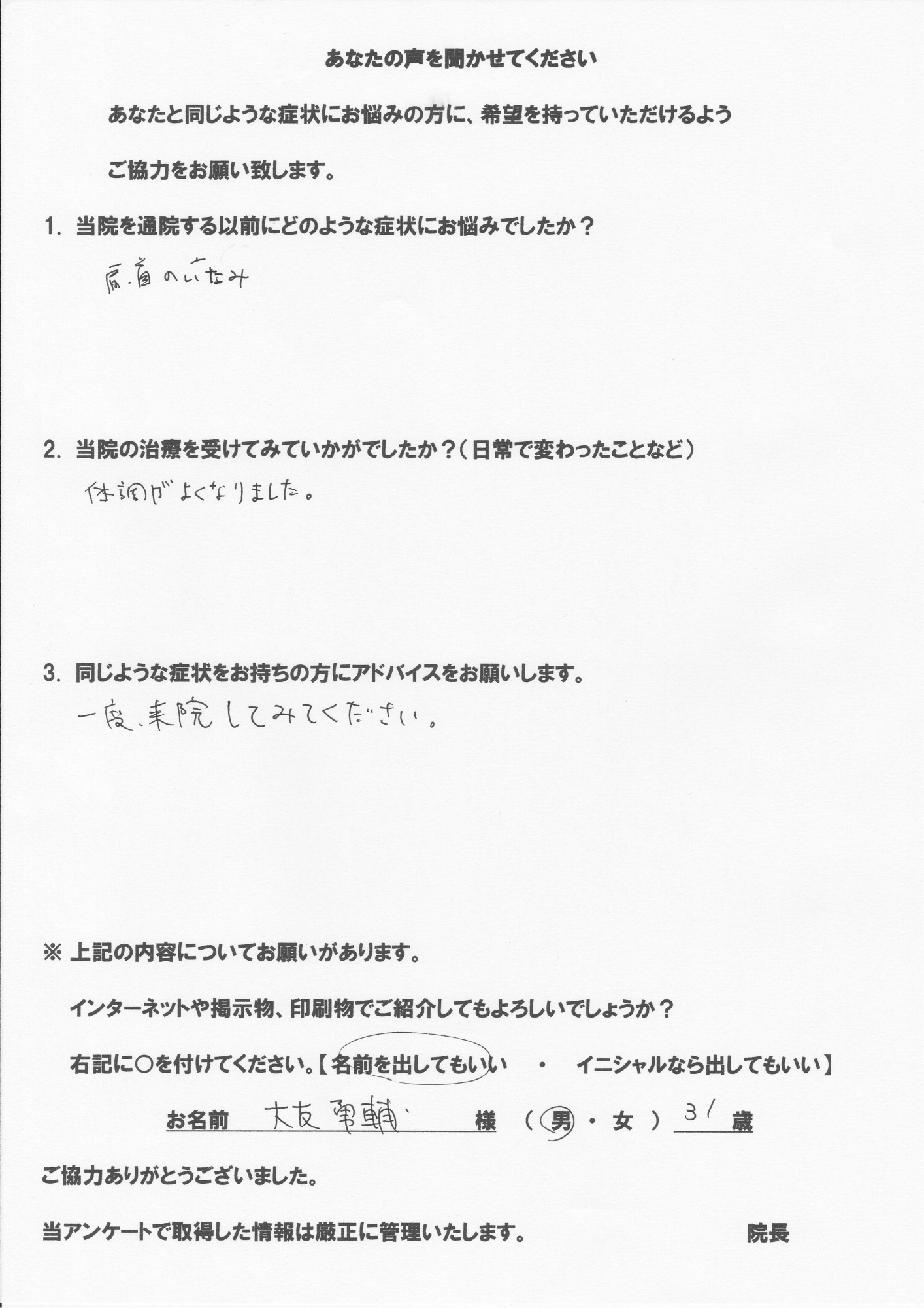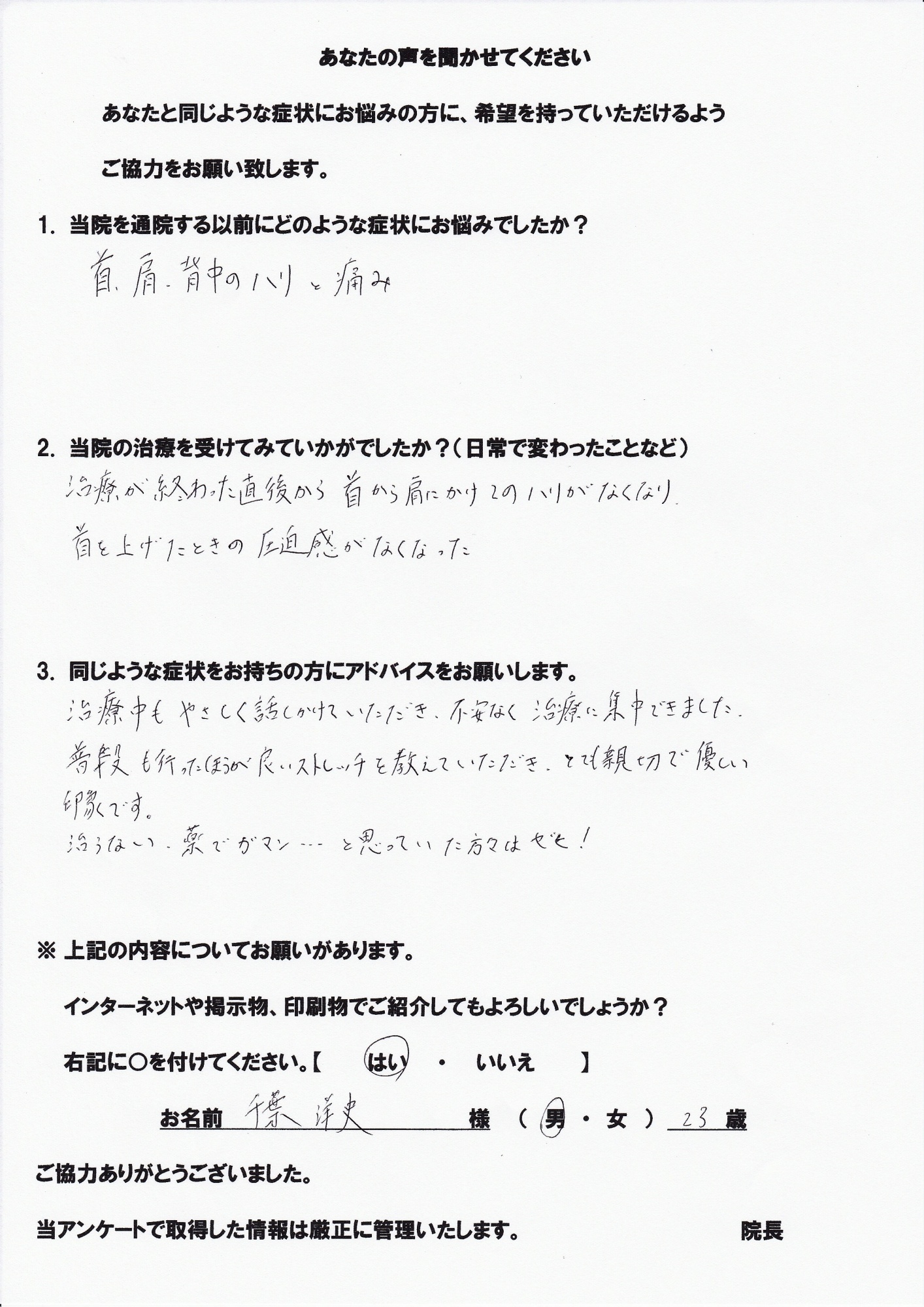 治療が終わった直後から首から肩にかけてのハリが無くなり、首を上げた時の圧迫感が無くなった。