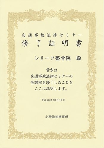 交通事故法律セミナーの修了証明書です。「全国交通事故認定治療院」に選出されたレリーフ整骨院では、常に法令を遵守し交通事故施術にあたっております。